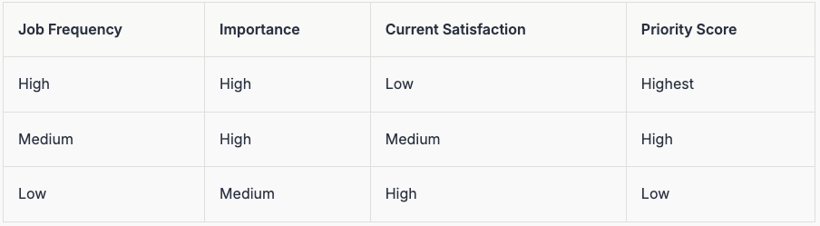 Product teams often use these criteria to decide which jobs to tackle first. For instance, B2B SaaS companies benchmark job prioritization to ensure they are solving the most valuable problems, leading to stronger product-market fit and growth.