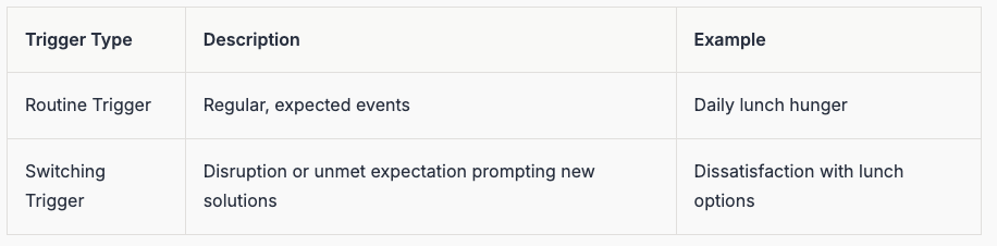 At the heart of every JTBD lies a trigger—an event or situation that sparks the customer's journey. Triggers can be as simple as feeling hungry or as complex as moving to a new city. They create urgency and motivate people to seek solutions.
